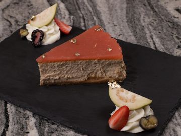 Suave cheesecake de textura aterciopelada, cubierto con una capa brillante de guayaba natural que envuelve cada bocado con dulzura y frescura.