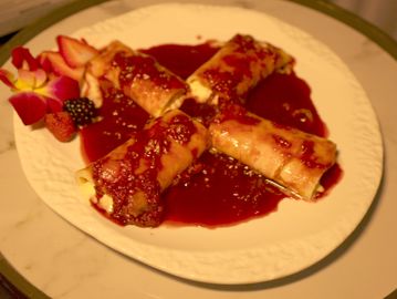 Crepas calientes rellenas de nieve cremosa, servidas con nuestra mermelada de la casa.