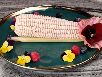 El clásico sabor a elote en una nieve cremosa, con un toque de tequila que le da carácter. Hecha en forma de mazorca real y servida con flores comestibles y frutos rojos.
