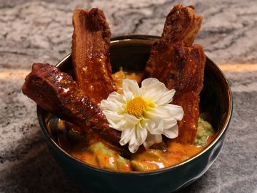 Una libra de costilla (6 piezas, ) bañada en nuestra explosiva salsa tatemada, con aguacate fresco al centro y tortillas de maíz para crear tu propio taco. ¡Un platillo único, lleno de sabor y carácter!