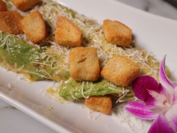Nuestro aderezo ancestral se prepara frente a ti: yemas, Dijon, ajo, anchoas, alcaparras, salsa inglesa y aceite de oliva, todo perfectamente emulsionado. Lo servimos sobre lechuga romana fresca, con parmesano y crotones dorados.