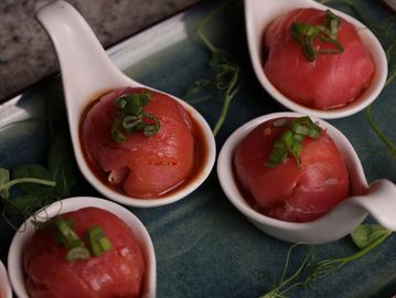 Cinco esferas de atún rellenas de suave kanikama, bañadas en nuestra irresistible salsa tiradito y coronadas con cebollín fresco. Ligeras, sabrosas y perfectas para empezar.
