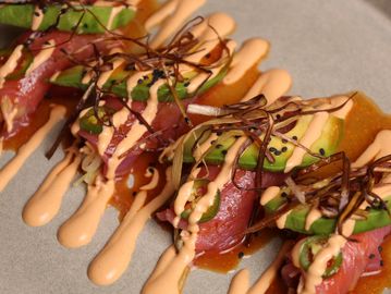 Atún en láminas finas, bañado en nuestra salsa tiradito con un toque cítrico y especiado, y coronado con rodajas de serrano que despiertan cada bocado.