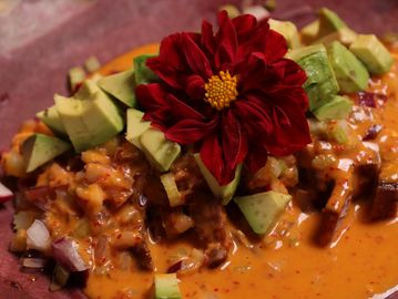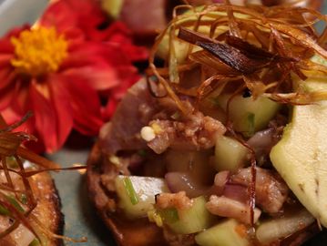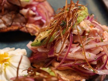 Crujientes mini tostadas con una base cremosa de aderezo de chipotle, coronadas con camarón marinado en salsa chiltepín, cebolla morada en julianas, aguacate fresco, poro frito y un toque de furikake. Picantes, cremosas y llenas de textura . El antojo que no vas a querer compartir.