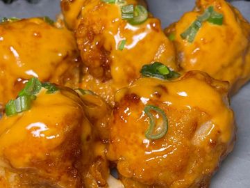 Seis piezas de coliflor capeada, doradas al punto perfecto, bañadas en nuestro aderezo de miel y rematadas con cebollín fresco. Ideal para compartir o disfrutar solo. ¡Una explosión de texturas!