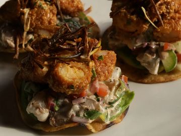 Tres mini tostadas que combinan lo crujiente y lo fresco: camarón empanizado bañado en un delicado aderezo de elote, acompañado de cremoso aguacate y coronado con poro frito que aporta un toque de textura y sabor irresistible. Cada bocado es una explosión de sabor y color.