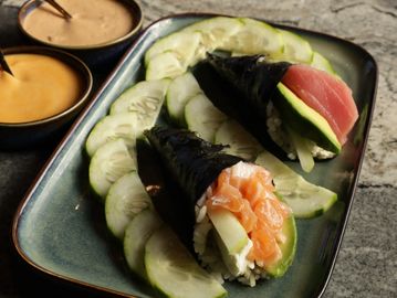 Cono de alga nori relleno de pepino y cremoso aguacate, acompañado de tu elección de proteína entre salmón o atún. Cada bocado ofrece una explosión de frescura y sabor, ideal para disfrutar al instante.