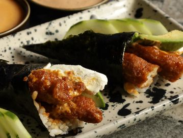 Cono de alga nori relleno de camarón empanizado bañado en delicado aderezo de elote, queso Philadelphia, aguacate y pepino fresco. Cada bocado combina cremosidad, frescura y un toque irresistible de sabor, creando una experiencia que invita a disfrutar al máximo.