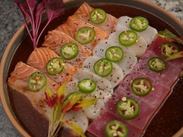 Finas láminas de atún, salmón y callo de hacha, perfectamente frescos, sumergidos en nuestra salsa tiradito con el equilibrio justo de acidez y sabor. Cada bocado es suave, fresco y adictivamente delicioso.