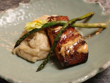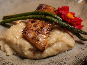8 oz de salmón sellado y bañado en nuestro adobo zarandeado de la casa: especiado, ahumado y lleno de sabor. Acompañado de puré de papa suave y espárragos verdes salteados.