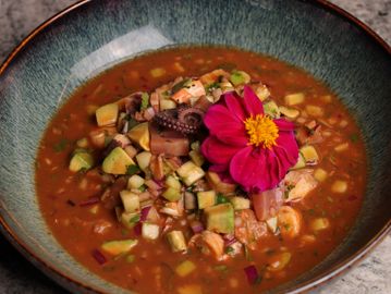 Camarón cocido, pulpo y atún curtidos en limón, con pepino, cebolla morada, serrano, aguacate y cilantro, todo bañado en una salsa a su elección: Salsa tiradito o Sombra del Pacifico, sabor marino y un picante que atrapa.