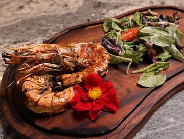 Dos camarones U3 salvajes cocinados al Josper, con esa textura firme y ese toque ahumado que te hace cerrar los ojos al primer bocado. Acompañados de spring mix fresco.