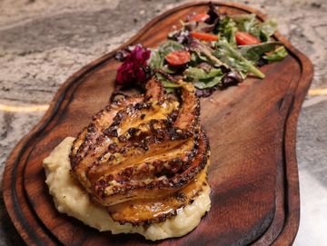 Pulpo zarandeado al Josper, con ese toque ahumado que sólo da el carbón. Servido sobre puré de papa y acompañado de spring mix fresco.